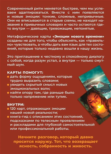Метафорические карты "Эмоции нового времени" созданы не для того, чтобы объяснять, как "правильно" чувствовать, а чтобы дать вам язык для тех состояний, которые только недавно вошли в нашу жизнь. Это приглашение к честному и спокойному диалогу с собой, когда разум устал, а внутри — только смутный шум. Начните разговор, который давно просится наружу. Тот, что возвращает ясность, собранность и живость.