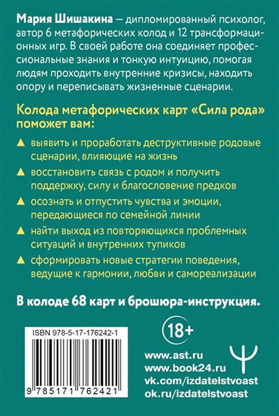 Колода МАК "Сила рода" создана для глубокой и одновременно бережной работы с родовыми программами, которые могут незаметно влиять на нашу жизнь: повторяющиеся трудности, хроническое невезение, страхи, чувство одиночества или внутренней пустоты. Карты помогают выявить скрытые сценарии, передающиеся из поколения в поколение, освободиться от их влияния и вернуть себе доступ к настоящему ресурсу — поддержке своего Рода.