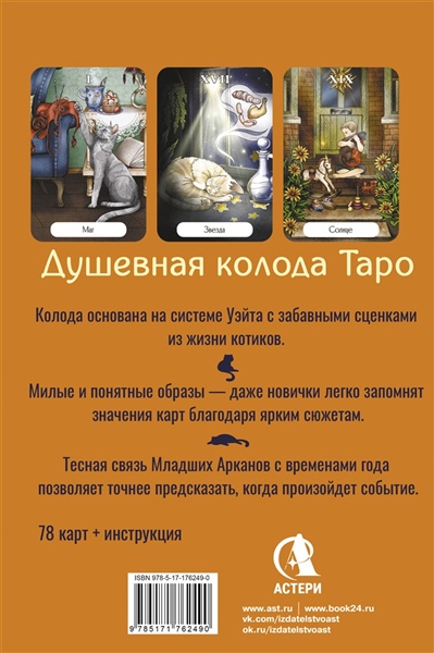 Автор Ольга Соллар и художница Екатерина Широкова создали уникальное Таро, где каждый Аркан оживает в образах озорных, мудрых и трогательных котиков. Колода основана на системе Уэйта, но вместо классических символов — забавные сценки из жизни котов: они охотятся за солнечными зайчиками, воруют колбасу, дерутся за территорию или сладко спят, свернувшись калачиком.