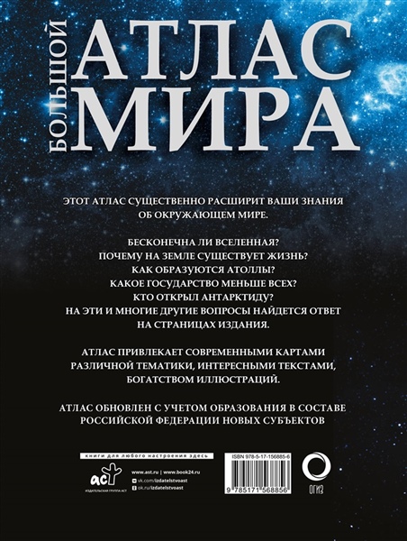Атлас в наглядной и доступной форме дает читателю необходимые основы знаний по широкому кругу вопросов, касающихся устройства окружающего нас мира. Раздел "Земля во Вселенной" посвящён происхождению и эволюции нашей планеты, особенностям ее внутреннего и внешнего строения, обусловившим зарождение жизни на Земле. В разделе "Человек на Земле" в картографическом виде представлено многообразие народов, языков, религий, различных форм человеческой деятельности. Раздел "Политическое устройство мира" содержит карты и самые важные систематизированные сведения обо всех независимых государствах мира. Атлас предназначен как для школьников, так и для всех, интересующихся устройством современного мира.