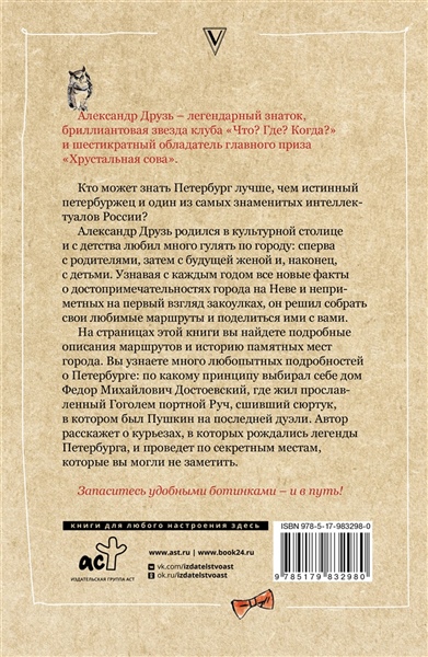 Александр Друзьлегендарный знаток, бриллиантовая звезда клуба Что? Где? Когда? и четырехкратный обладатель главного приза Хрустальная сова.Кто может знать Петербург лучше, чем истинный петербуржец и один из самых знаменитых интеллектуалов России? Александр Друзь родился в культурной столице и с детства любил много гулять по городу: сперва с родителями, затем с будущей женой и, наконец, с детьми. Узнавая с каждым годом все новые факты о достопримечательностях города на Неве и неприметных на первый взгляд закоулках, он решил собрать свои любимые маршруты и поделиться ими с вами.На страницах этой книги вы найдете подробные описания маршрутов и историю памятных мест города. Вы узнаете много любопытных подробностей о Петербурге: по какому принципу выбирал себе дом Федор Михайлович Достоевский, где жил прославленный Гоголем портной Роуч, сшивший сюртук, в котором был Пушкин на последней дуэли. Автор расскажет о курьезах, в которых рождались легенды Петербурга, и проведет по секретным местам, которые вы могли не заметить.Запаситесь удобными ботинкамии в путь!