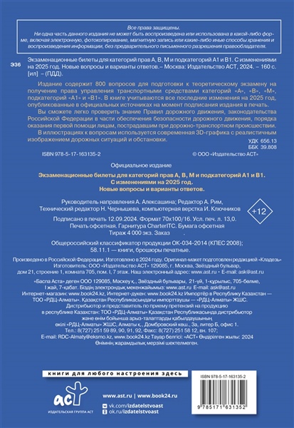 Издание содержит 800 вопросов для подготовки к теоретическому экзамену на получение права управления транспортными средствами категорий "А", "В", "М", подкатегорий "А1" и "В1". В книге учитываются все последние изменения на 2025 год, опубликованные в официальных источниках на момент подписания издания в печать. В иллюстрациях к вопросам используется современная 3D-графика с реалистичным изображением дорожных ситуаций и обстановки. Благодаря этой книге вы сможете легко проверить знание ПДД и законодательства Российской Федерации в части обеспечения безопасности дорожного движения, порядка оказания первой помощи лицам, пострадавшим при ДТП.