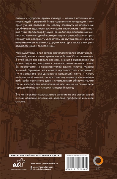 Межкультурный опыт автора впечатляет: более 20 лет исследований, жизнь в пяти странах и еще более 50-ти за плечами. В этой книге она собрала все свои знания о мировоззрении разных народов, которыми с удовольствием делится с вами. Вы посмотрите на представителей других культур глазами жителей Германии: не сможете противостоять сдержанному очарованию скандинавских концепций хюгге и лагом, найдете свой икигай, по достоинству оцените философию ваби-саби, постигнете дзен и с удивлением обнаружите, что такие, казалось бы, непохожие на нас немцы на самом деле гораздо ближе, чем кажется на первый взгляд.