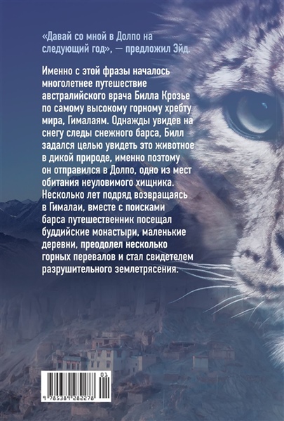 Жажда приключений и новых открытий привела австралийского врача Билла Крозье к многолетним странствиям по Гималаям. Однажды увидев на снегу следы снежного барса, Билл задался целью увидеть это животное в дикой природе, именно поэтому он отправился в Долпо, одно из мест обитания неуловимого хищника. Несколько лет подряд возвращаясь в Гималаи, вместе с поисками барса, путешественник посещал буддийские монастыри, маленькие деревни, преодолел несколько горных перевалов и стал свидетелем разрушительного землетрясения.