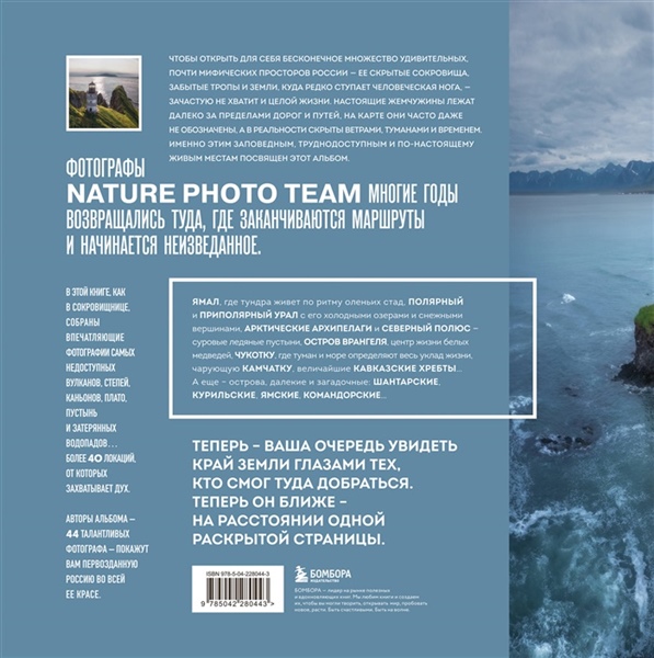 Эту книгу создали фотографы Nature Photo Team — люди, которые годами возвращались туда, где заканчиваются дороги и начинается настоящая дикая земля. Они прошли Ямал и Полярный Урал, добирались до арктических архипелагов и Северного полюса, снимали Камчатку, Кавказ, Чукотку, остров Врангеля и самые отдаленные острова — Шантарские, Курильские, Командорские, Ямские.