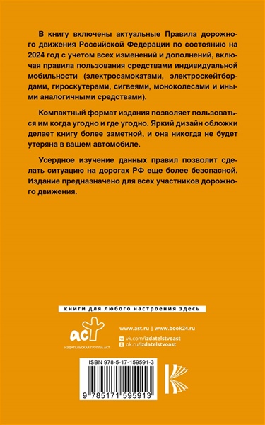 В книгу включены актуальные Правила дорожного движения Российской Федерации по состоянию на 2024 год с учетом всех изменений и дополнений, включая правила пользования средствами индивидуальной мобильности (электросамокатами, электроскейтбордами, гироскутерами, сигвеями, моноколесами и иными аналогичными средствами). Компактный формат издания позволяет пользоваться им когда угодно и где угодно. Яркий дизайн обложки делает книгу более заметной, и она никогда не будет утеряна в вашем автомобиле. Цель данного издания донести до широкого круга людей нормы, направленные на предупреждение ДТП и снижение тяжести их последствий. Усердное изучение данных правил позволит сделать ситуацию на дорогах РФ еще более безопасной. Издание учитывает все изменения, опубликованные в официальных источниках на момент подписания издания в печать.