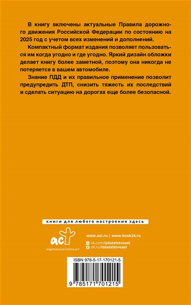 В книгу включены актуальные Правила дорожного движения Российской Федерации по состоянию на 2025 год с учетом всех изменений и дополнений. Компактный формат издания позволяет пользоваться им когда угодно и где угодно. Яркий дизайн обложки делает книгу более заметной, поэтому она никогда не потеряется в вашем автомобиле. Знание ПДД и их правильное применение позволит предупредить ДТП, снизить тяжесть их последствий и сделать ситуацию на дорогах еще более безопасной. Издание учитывает все изменения, опубликованные в официальных источниках на момент подписания издания в печать.