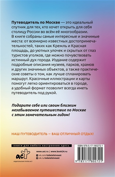 Путеводитель по Москве — это идеальный спутник для тех, кто хочет открыть для себя столицу России во всём её многообразии. В книге собраны самые интересные и значимые места: от всемирно известных достопримечательностей, таких как Кремль и Красная площадь, до уютных улочек и скрытых от глаз туристов уголков, где можно почувствовать истинный дух города. Издание содержит подробные описания музеев, парков, храмов и других значимых объектов, а также практические советы о том, как лучше спланировать маршрут. Красочные иллюстрации и карты помогут легко ориентироваться в городе, а удобный формат позволит всегда иметь путеводитель под рукой. Подарите себе или своим близким незабываемое путешествие по Москве с этим замечательным гидом!