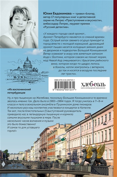 Каждый человек, живущий в России, имеет свое представление о Санкт-Петербурге. Главное же в нем — его непредсказуемость. Поэтому одни восхищаются этим городом, другие ни за что не хотят ехать в него второй раз. Одни видят его только в сиянии солнечных лучей — везет! Других Петербург встречает исключительно дождем, ветром, холодом, недружелюбностью, угрюмостью, неудобствами. И все-таки этот город манит, притягивает, и порой заставляет поменять свое мнение о нем. Что случилось и с автором этой книги. В ней Юлия Евдокимова приоткроет секрет, как полюбить его, что обязательно разыскать и чем полакомиться, и это последнее точно вдохновит, потому что таких пышек с кофе, такой рыбки корюшки и таких конфет фабрики Н. Крупской точно не сыщется в других городах. Вас ждут Васильевский остров, Петроградская сторона, Коломна, роскошные петербургские сады и ангелы на шпилях и на скамейках.