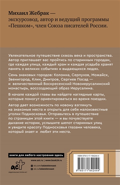 Откройте для себя Подмосковье глазами опытного экскурсовода и увлеченного рассказчика — Михаила Жебрака, автора и ведущего популярной программы "Пешком", члена Союза писателей России. Эта книга — увлекательное путешествие сквозь века и пространства. Автор приглашает вас пройтись по старинным городам, где каждая улица, каждый храм и каждая усадьба хранят память о великих событиях и выдающихся людях. Семь знаковых городов: Коломна, Серпухов, Можайск, Звенигород, Клин, Дмитров, Сергиев Посад — и величественный Воскресенский Новоиерусалимский монастырь, воссоздающий образ Иерусалима. Архитектурные шедевры: от древних монастырей и кремлей до сохранившихся усадеб и имений, которые раскрывают богатую историю региона. Занимательные истории: увлекательные рассказы о знаменитых жителях этих мест, их судьбах и вкладе в историю России. Практические схемы городов: в начале каждой главы вы найдете наглядные карты, которые помогут ориентироваться во время поездки. Яркие фотографии: визуальное сопровождение, позволяющее заранее оценить красоту и атмосферу каждого места. Книга сочетает глубокие знания автора с живым, образным повествованием. Дает возможность по новому взглянуть на знакомые места и открыть для себя малоизвестные уголки Подмосковья. Помогает спланировать маршрут и не упустить самое интересное во время путешествия. Погружает в исторический контекст, связывая прошлое и настоящее подмосковных городов. Книга будет интересна: туристам, желающим исследовать Подмосковье; любителям истории и архитектуры; тем, кто ценит качественные путеводители с авторским взглядом; жителям Подмосковья, желающим лучше узнать родной край. Отправьтесь в путешествие по страницам этой книги — и вы почувствуете дыхание истории, услышите шепот старинных улиц и увидите красоту Подмосковья глазами человека, который знает и любит эти места.