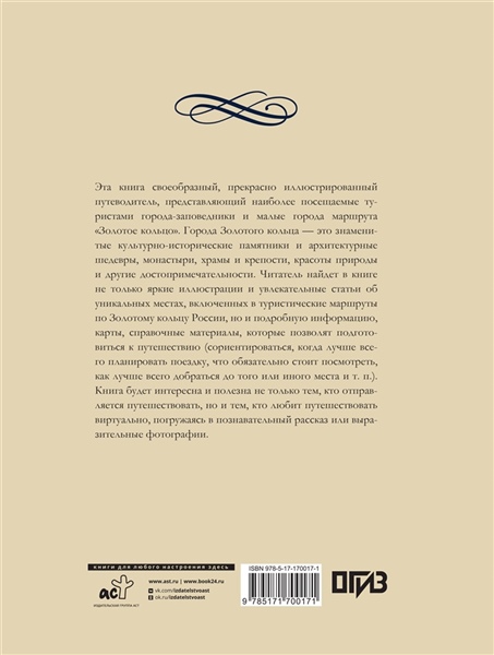 Термин "Золотое кольцо России", появившись полвека назад, официального статуса не имеет,а обозначает туристический маршрут по некоторым городам Центральной России, представляющимисторическую и культурную ценность. Соединенные автомобильными дорогами, они формируют символический круг, олицетворяющий богатейшее культурное наследие нашей страны. В Золотое кольцовходят города-заповедники и малые городаМосковской, Владимирской, Костромской, Ивановской и Ярославской областей.Главное, что объединяет эти места, – уникальные памятники архитектуры и искусства, сохранившиеся до наших дней."Золотое кольцо" – это путешествие к истокам,где сохранилисьдетали давно ушедшего времени,атмосфера исконной Руси. В книге вы найдете информацию о туристическом маршруте "Золотое кольцо России" – это монастыри,храмы и крепости, знаменитые культурно-исторические памятники и архитектурные шедевры, красоты природы и другие достопримечательности. Прочитаете о местах, где природа располагает к отдыху ивдохновляет на творчество. Узнаете, какие традиционные национальные сувениры и где можно приобрести. Читатель найдет в книге не только яркие иллюстрации и увлекательные статьи об уникальных местах, включенных в туристические маршруты по Золотому кольцу России, но и подробную информацию, карты, справочные материалы, которые позволят подготовиться к путешествию (сориентироваться, когда лучше всего планировать поездку, что обязательно стоит посмотреть, как лучше всего добраться до того или иного места и т. п.). Книга будет интересна и полезна не только тем, кто отправляется путешествовать, но и тем, кто любит путешествовать виртуально, погружаясь в познавательный рассказ или выразительные фотографии.
