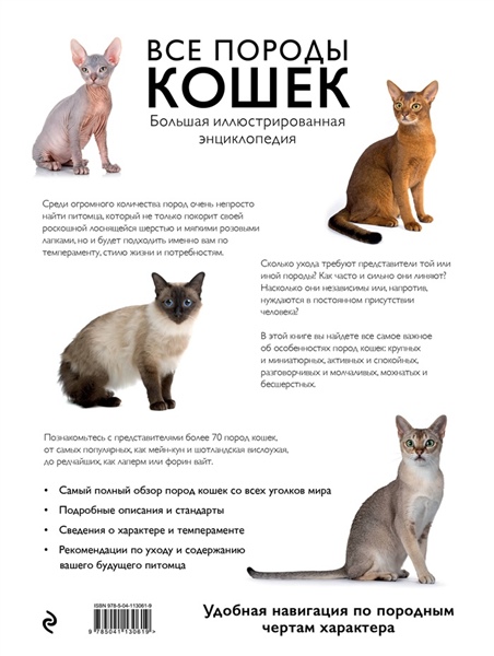 Каждая порода отличается своими особенностями в поведении, уходе и воспитании. Эта книга поможет выбрать именно ту кошку, которая не только зацепит своей неповторимой красотой и изящностью, но будет близка вам по характеру, образу жизни и предпочтениям. В ней рассказано обо всех популярных породах: крупных и миниатюрных, активных и спокойных, пушистых и короткошерстных. В обзоре каждой породы вы найдете подробное описание и стандарты, сведения о темпераменте будущего питомца, рекомендации по уходу и содержанию.