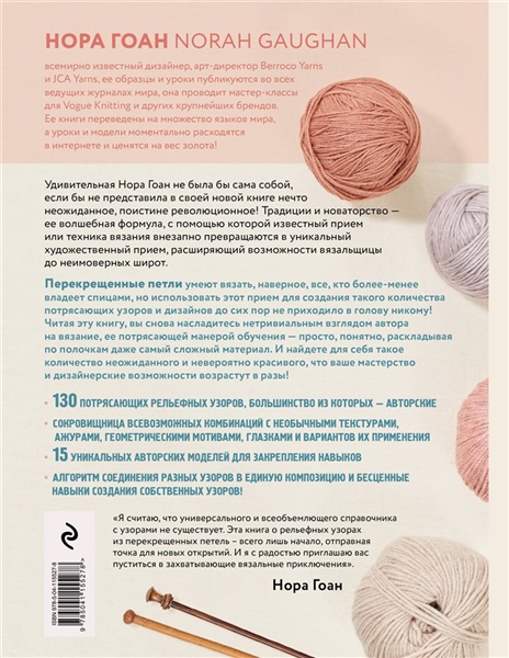 Нора Гоан совершает очередную революцию в вязании! Этот необычный мастер мирового уровня,"рок-звезда" в мире вязания, обладает настолько бурной фантазией и нетривиальным взглядом на создание вязаных вещей, что делать что-то невероятное, потрясающее, инновационное для нее в порядке вещей! 130 узоров, 15 авторских моделей и неисчислимое количество комбинаций — все это уместилось в ее новой книге! А главное — все это из перекрещенных петель, которые умеет вязать даже новичок. Текстуры, глазки, геометрические мотивы — обыкновенный технический прием в руках Норы внезапно превращается в уникальное средство художественного самовыражения. Потрясающие рельефные мотивы, возникающие на вязаном полотне, не только просто вязать, они удивительно расширяют дизайнерскийпотенциал любого мастера. А еще Нора Гоан умеет преподать стройную теорию так, что вы получите уникальный инструмент для создания собственных узоров и моделей."Эта книга — всего лишь начало, отправная точка для новых открытий. И я с радостью приглашаю вас пуститься в захватывающие вязальные приключения".Нора Гоан