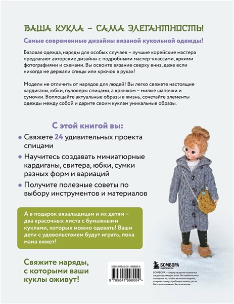 Вы станете настоящим дизайнером современной одежды для кукол! Вместе с лучшими корейскими мастерами вы свяжете спицами 24 удивительных проекта миниатюрной одежды. Кардиганы, юбки, пуловеры, сумочки и шапочки — каждая модель детально проработана и не уступает настоящей одежде. По понятным схемам и порядным описаниям вы легко свяжете модели из книги, даже если никогда не держали в руках спицы или крючок! А в подарок вязальщицам и их детям — два красочных листа с бумажными куклами, которых можно одевать! Ваши дети с удовольствием будут играть, пока мама вяжет!