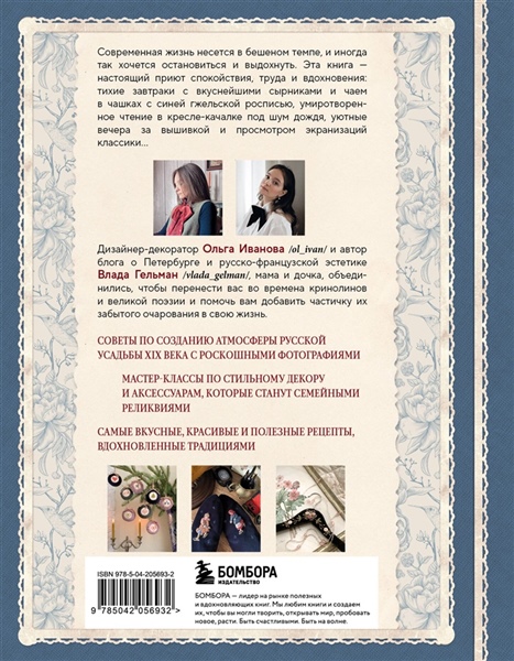 Современная жизнь несется в бешеном темпе, каждый день приносит новый стресс, появляются миллионы новых товаров, которые не проживут и года. И, как никогда раньше, хочется остановиться, выдохнуть, и обратиться к чему-то вечному, незыблемому. Поискать вдохновения не в зыбком будущем, а в знакомом прошлом. Эта книга — настоящий приют спокойствия, труда и вдохновения: тихие завтраки с вкуснейшими сырниками и чаем в чашках с синей гжельской росписью, умиротворенное чтение в кресле-качалке под шум дождя, уютные вечера за вышивкой и просмотром экранизаций классики…