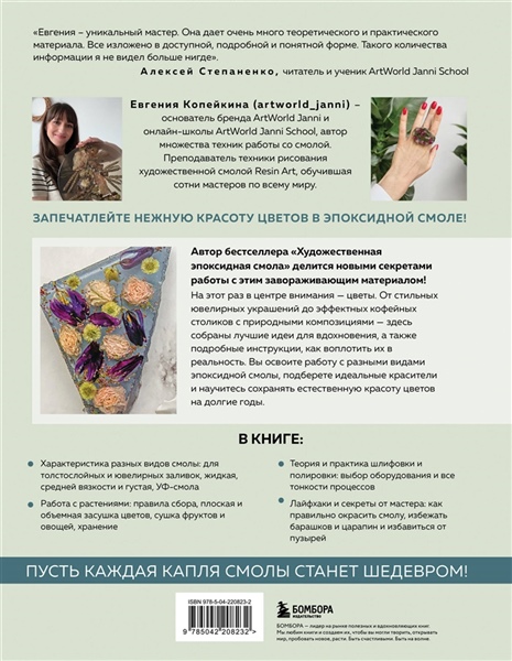 Запечатлейте нежную красоту цветов в эпоксидной смоле! Автор бестселлера «Художественная эпоксидная смола» делится новыми секретами работы с этим завораживающим материалом! На этот раз в центре внимания – цветы. От стильных ювелирных украшений до эффектных кофейных столиков с природными композициями — здесь собраны лучшие идеи для вдохновения, а также подробные инструкции, как воплотить идеи в реальность. Вы освоите работу с разными видами эпоксидной смолы, подберете идеальные красители и научитесь сохранять естественную красоту цветов на долгие годы. В книге: - Характеристика разных видов смолы: для толстослойных и ювелирных заливок, жидкая, средней вязкости и густая, УФ-смола. - Работа с растениями: правила сбора, плоская и объемная засушка цветов, сушка фруктов и овощей, хранение. - Теория и практика шлифовки и полировки: выбор оборудования и все тонкости процессов. - Лайфхаки и секреты от мастера: как правильно окрасить смолу, избежать барашков и царапин и избавиться от пузырей. - Новая коллекция потрясающих мастер-классов: стильные украшения, ваза для цветов, шахматы, елочные игрушки и даже столы. Пусть каждая капля смолы станет шедевром! Евгения Копейкина artworld_janni — основатель бренда ArtWorld Janni и онлайн-школы ArtWorld Janni School, автор множества техник работы со смолой. Преподаватель техники рисования художественной смолой Resin Art, обучившая сотни мастеров по всему миру.