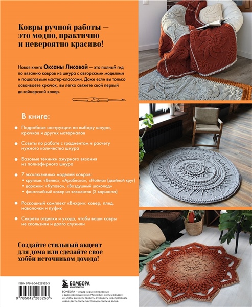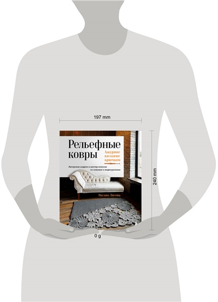 В книге представлены 7 уникальных ковров ручной работы: круглые, дорожки, фантазийные, а еще роскошный интерьерный набор в едином стиле: ковер, наволочка и пуфик.