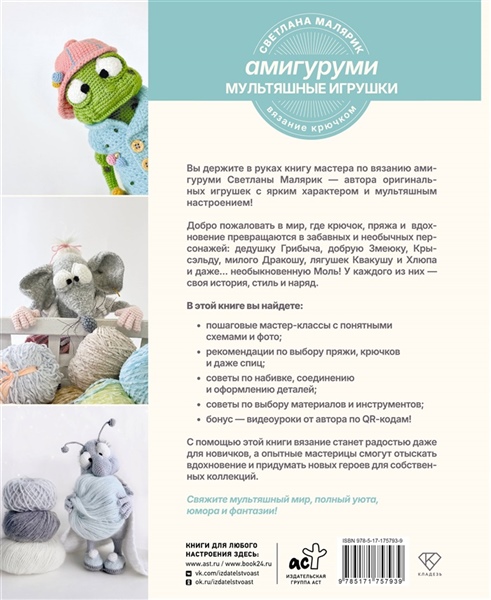 В книге представлено 6 мастер-классов, по которым можно связать крючком забавных и необычных персонажей: дедушку Грибыча, добрую Змеюку, очаровательную Крысэльду, милого Дракошу, лягушек Квакушу и мистера Хлюпа, а также необыкновенную Моль. Все мастер-классы сопровождают пошаговые фото, описания по рядам, советы по выбору инструментов и материалов, набивке, соединению и оформлению деталей. Также в книге собраны основные приемы вязания и видеоуроки от автора, доступные по QR-кодам.