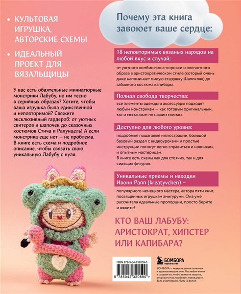 У вас есть обаятельные миниатюрные монстрики Лабубу, но им не хватает индивидуальности? Подарите им настоящее модное преображение с помощью крючка и этой удивительной книги! А если монстрика еще нет — не проблема. В книге есть схема и подробное описание для стоячего и сидячего варианта, чтобы связать свою уникальную Лабубу с нуля. Если следовать рекомендациям по пряже, то размер игрушки будет один в один с покупной игрушкой. Почему эта книга завоюет ваше сердце: • 18 неповторимых вязаных нарядов на любой вкус и случай: От уютного комбинезона-коровки и элегантного образа в аристократическом стиле (который очень даже напоминает милую старушку Шапокляк) до забавного костюма капибары. Каждый аутфит — это шанс проявить фантазию! • Полная свобода творчества: Все элементы одежды и аксессуары подходят любым монстрикам — как готовым оригинальным, так и связанным по нашим схемам. • Доступно для любого уровня: Подробные пошаговые иллюстрации, большой базовый раздел с видеоуроками и простые инструкции помогут легко справиться с моделью и новичкам, и опытным мастерицам. В книге есть схемы как для стоячих, так и для сидящих фигурок. • Книгу создала Ювонна Рапп (kreatyvchen), для которой вязание — настоящая страсть. Ее авторские куклы и зверушки всегда наполнены игривым характером и любовью к деталям. Свяжите себе и своим брелокам хорошее настроение! Подарите себе и своим маленьким спутникам новый, стильный образ на каждый день! Эта книга — идеальное решение для вас, если: • Вы вяжете крючком амигуруми и ищете конкретные схемы для одежды куклам и зверушкам. • У вас есть коллекция брелоков-монстриков (привет, Labubu!), и вы хотите одеть их по своему вкусу, а не искать редкие и дорогие готовые наряды. • Вам нужны понятные инструкции с фото и видео, чтобы сразу приступить к вязанию, даже если вы новичок.