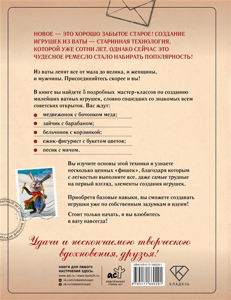 В этой книге собрано 5 мастер-классов по созданию веселых и добрых зверят, словно только что сошедших с советских открыток. На ее страницах вас ждут медвежонок с бочонком меда, зайчик с барабаном, бельчонок с корзинкой, ежик-фигурист с букетом цветов и песик с мячом.