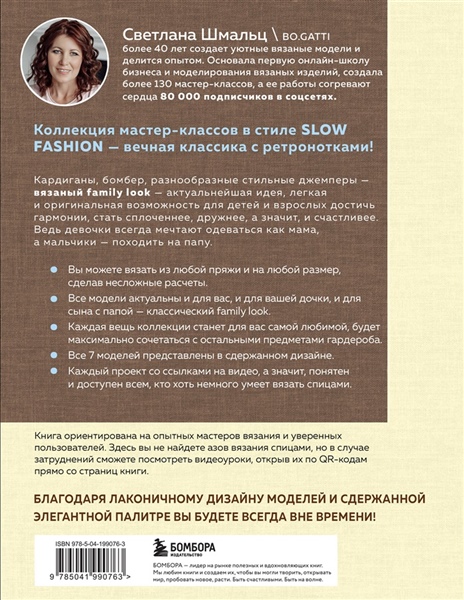 Уникальная коллекция мастер-классов в стиле SLOW FASHION — вечная классика с ретро-нотками, от замечательного мастера Светланы Шмальц, известной в Сети как непревзойденный эксперт вязаной семейной моды. Все девочки мечтают одеваться, как мама, а мальчики — походить на папу. Вязаный family look актуален как никогда, ведь именно этот стиль дает возможность достичь взаимопонимания и семейной гармонии, стать сплоченнее, дружнее, а значит, счастливее. Кардиганы, бомберы, разнообразные стильные джемперы — в едином стиле для мамы и дочки, для папы и сына. И все это с огромным вкусом и мастерством. Светлана Шмальц с удовольствием делится своими навыками с читателями и делает это непосредственно на практике. Подробные, богато проиллюстрированные мастер-классы, великолепные фотографии, на которых видно, как смотрится вживую та или иная авторская модель. Откройте для себя вязание нового уровня, когда каждая вещь рассчитана на то, чтобы стать любимой и носиться годами, а процесс вязания доставляет ни с чем не сравнимое удовольствие! • Вы можете вязать из любой пряжи и на любой размер, сделав несложные расчеты. • Все модели актуальны и для вас, и для вашей дочки, и для сына с папой — классический фэмили лук. • Каждая вещь коллекции станет для вас самой любимой, будет максимально сочетаться с остальными предметами гардероба. • Все 7 моделей представлены в сдержанном дизайне для комфортной носки как детям, так и взрослым. • Каждый проект с ссылками на видео, а значит, понятен и доступен всем, кто хоть немного умеет вязать спицами. «Медленная мода» на спицах — это не просто вязание, это философия: делать меньше, но лучше, выбирать качественное, создавать с душой. Об авторе: Светлана Шмальц / bo.gatti Уже более 40 лет создает уютные вязаные модели и делится своим опытом. Основала первую онлайн-школу бизнеса и моделирования вязаных изделий, создала более 130 мастер-классов, а ее работы согревают сердца 80 000 подписчиков в соцсетях.