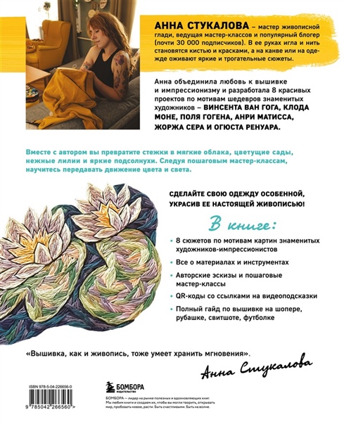 Анна Стукалова — мастер живописной глади. Она разработала 8 красивейших проектов по мотивам шедевров знаменитых художников-импрессионистов. Превратите стежки в мягкие облака, цветущие сады, нежные лилии и яркие подсолнухи! По пошаговым мастер-классам научитесь передавать движение цвета и света и изучите все тонкости вышивки по разным тканям, сделав особенными любые аксессуары и одежду.