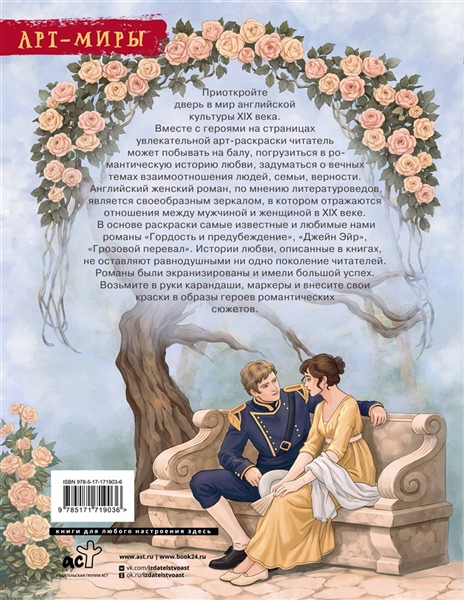 Приоткройте дверь в мир английской культуры XIX века. Вместе с героями на страницах увлекательной арт-раскраски читатель может побывать на балу, погрузиться в романтическую историю любви, задуматься о вечных темах взаимоотношения людей, семьи, верности. Английский женский роман, по мнению литературоведов, является своеобразным зеркалом, в котором отражаются отношения между мужчиной и женщиной в XIX веке. Эти произведения получают особое распространение в викторианскую эпоху — период высоких нравственных ценностей и порядка, воспитывающий стремление к идеальной семье и отношениям. В основе раскраски самые известные и любимые нами романы "Гордость и предубеждение", "Джейн Эйр", "Грозовой перевал". Истории любви, описанные в книгах, не оставляют равнодушными ни одно поколение читателей. Романы были экранизированы и имели большой успех. Возьмите в руки карандаши, маркеры и внесите свои краски в образы героев романтических сюжетов.