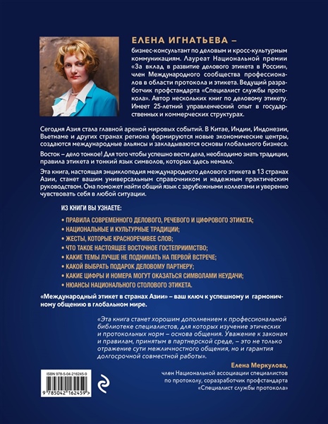 Перед вами книга, в которой собрано все необходимое, что нужно знать о правилах международного делового этикета в странах Азии — от Китая и Индии до Турции и ОАЭ. Издание состоит из двух частей. В первой вы найдете ответы на все вопросы, связанные с деловой жизнью: от составления гардероба и ведения переговоров до организации официальных мероприятий. Вторая часть посвящена особенностям делового общения в 13 странах Азии. Здесь вы найдете краткую информацию о странах, национальном характере и кухне, традициях деловой коммуникации, размере принятых чаевых, правилах поведения при личных встречах и дресс-коде. Кроме того, книга содержит множество интересных сведений о происхождении различных правил этикета, а также любопытные факты и забавные истории, связанные с их нарушением или незнанием. Автор книги — Елена Игнатьева, бизнес-консультант, тренер по этикету, административному управлению, деловым и кросс-культурным коммуникациям, детально раскрывает правила, нормы и тонкости делового общения, знание которых позволит избежать распространенных ошибок и откроет двери к долгосрочному сотрудничеству.