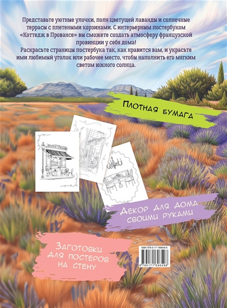 Представьте уютные улочки, поля цветущей лаванды и солнечные террасы с плетеными корзинами. С интерьерным постербуком "Коттедж в Провансе" вы сможете создать атмосферу французской провинции у себя дома! Раскрасьте страницы постербука так, как нравится вам, и украсьте ими любимый уголок или рабочее место, чтобы наполнить его мягким светом южного солнца.