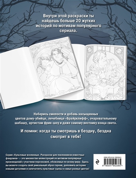 Погрузитесь в невероятную атмосферу культового сериала American horror story. Внутри этой раскраски вас ждут знакомые сюжеты и любимые персонажи: от дома убийцы и семьи Хармон до вестника конца света — Майкла Лэнгдона и кровавой графини Элизабет. Запаситесь храбростью и любимыми карандашами или маркерами и постарайтесь сохранить рассудок, раскрашивая призраков, ведьм, сиамских близнецов и клоуна-убийцу. Серия «Культовые вселенные. Раскраски для поклонников известных фандомов» — это множество иллюстраций по мотивам популярных произведений с участием персонажей, обожаемых по всему миру. Здесь вы можете создать свой уникальный образ героев, дополнить историю новыми деталями и запечатлеть культовые сцены в самых разных цветах!