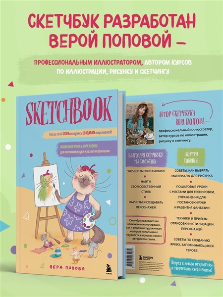 Благодаря скетчбуку ты сможешь улучшить свои навыки, найдешь свой собственный стиль в рисовании и научишься создавать персонажей. Скетчбук подходит как новичкам в иллюстрации, так и опытным художникам, которые испытывают трудности в поисках своего авторского стиля. Высококачественная белая бумага идеально подойдет для лайнеров, фломастеров, цветных карандашей, а также чернил и туши. Автор скетчбука Вера Попова — профессиональный иллюстратор, автор курсов по иллюстрации, рисунку и скетчингу. Внутри собраны: - советы, как выбрать материалы для рисунка; - пошаговые уроки с местами для тренировки; - упражнения для постановки руки и развития фантазии; - техники и приемы отрисовки и стилизации персонажей; - советы по созданию ярких запоминающихся героев. Вперед к новым открытиям и творческим свершениям! Учись и рисуй с удовольствием!