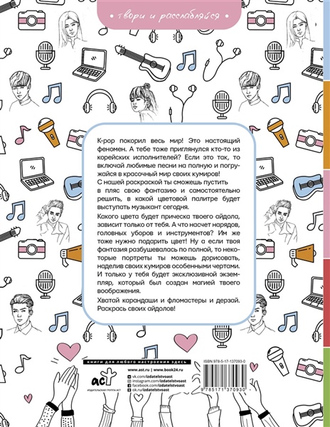 K-pop покорил весь мир! Это настоящий феномен. А тебе тоже приглянулся кто-то из корейских исполнителей? Если это так, то включай любимые песни на полную и погружайся в красочный мир своих кумиров! С нашей раскраской ты сможешь пустить в пляс свою фантазию и самостоятельно решить, в какой цветовой палитре будет выступать музыкант сегодня. Какого цвета будет прическа твоего айдола, зависит только от тебя. А что насчет нарядов, головных уборов и инструментов? Им же тоже нужно подарить цвет! Ну а если твоя фантазия разбушевалась по полной, то некоторые портреты ты можешь дорисовать, наделив своих кумиров особенными чертами. И только у тебя будет эксклюзивный экземпляр, который был создан магией твоего воображения. Хватай карандаши и фломастеры и дерзай. Раскрась своих айдолов!