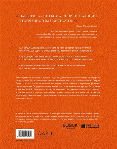 Алисон Джеймс, биограф и историк моды, создает детальный портрет легендарной семьи Hermès. Его исследование охватывает более века — от основателя Дома, Тьерри Эрмеса, до его потомков, которые поколение за поколением превращали фамилию Hermes в синоним безупречного стиля и символ исключительного мастерства. Это история о том, как одной семье удалось создать империю, где каждое изделие — это шедевр, а каждая деталь воплощает философию вечных ценностей, как верность традициям может идти рука об руку с инновациями, как ремесленное мастерство становится мерилом статуса.