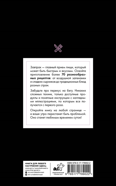 Завтрак – главный прием пищи, который может быть быстрым и вкусным. Освойте приготовление более 70 разнообразных рецептов: от воздушной запеканки и сладких сырников до традиционных блюд разных стран. Забудьте про перекус на бегу. Никаких сложных техник, только доступные продукты и понятные инструкции с наглядными иллюстрациями, по которым все получается с первого раза. Откройте книгу на любой странице — и ваше утро перестанет быть проблемой. Оно станет любимым временем суток!