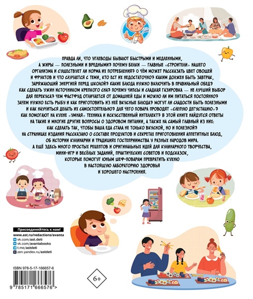 Эта книга способна превратить изучение основ здорового питания не только в весёлую и познавательную игру, но и в увлечение на всю жизнь. Юные читатели примерят на себя роль шеф-повара и окунутся в мир кулинарных знаний и вкусных экспериментов. Ребята узнают о том, какие суперсилы скрывает в себе сбалансированный завтрак, сытный обеди лёгкий ужин. А ещё они поймут, почему в питании так важны белки, жиры и углеводы,научатся отличать полезную еду от вредной и познакомятся с маленькими друзьями большого здоровья — витаминами и микроэлементами. Также мальчишки и девчонки отправятся в путешествие по континентам и эпохам, во время которого раскроют секреты приготовления хлеба, супов, горячих блюд и десертов, узнают о законах гостеприимства у самых разных народов, постигнут основы экокулинарии, психологии вкуса и даже молекулярной кухни будущего. На страницах этого издания с красочными иллюстрациями ребята найдут простые рецепты оригинальных блюд, творческие задания, мини-игры и множество ценных советов и подсказок, которые помогут научиться готовить полезную и вкусную еду легко и с удовольствием! Для широкого круга читателей.