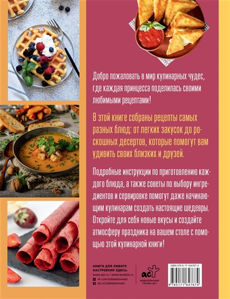 Добро пожаловать в мир кулинарных чудес, где каждая принцесса поделилась своими любимыми рецептами! В этой книге собраны рецепты самых разных блюд: от легких закусок до роскошных десертов, которые помогут вам удивить своих близких и друзей. Подробные инструкции по приготовлению каждого блюда, а также советы по выбору ингредиентов и сервировке помогут даже начинающим кулинарам создать настоящие шедевры. Откройте для себя новые вкусы и создайте атмосферу праздника на вашем столе с помощью этой кулинарной книги!