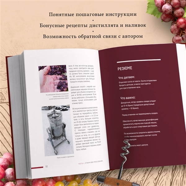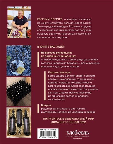 - Секреты мастера: автор щедро делится своим богатым опытом, накопленным годами, и раскрывает секреты, которые помогут вам избежать ошибок и создать вино исключительного качества. Вы узнаете, как приготовить изысканное вино из винограда сортов «Молдова» и «Изабелла».