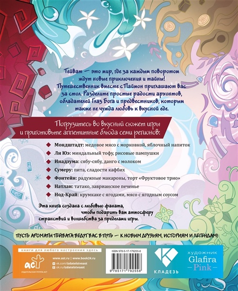 Тейват — это мир, где за каждым поворотом ждут новые приключения и тайны! Путешественник вместе с Паймон приглашают вас за стол. Разделите простые радости архонтов, обладателей Глаз Бога и предвестников, которым также не чужда любовь к вкусной еде. Погрузитесь во вкусный сюжет игры и приготовьте аппетитные блюда семи регионов: • Мондштадт: медовое мясо с морковкой, яблочный напиток • Ли Юэ: миндальный тофу, рисовые пампушки • Инадзума: сябу-сябу, данго с молоком • Сумеру: пита, сладости кафбих • Фонтейн: радужные макароны, тарт "Фруктовое трио" • Натлан: татако, заврианское печенье • Нод-Край: крумкаке с ягодами, мясо с ягодным соусом Эта книга создана с любовью фаната, чтобы подарить вам атмосферу странствий и волшебства за пределами игры. Пусть ароматы Тейвата ведут вас в путь — к новым друзьям, историям и легендам!
