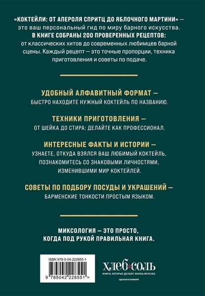 «Коктейли: от апероля спритц до яблочного мартини» — это ваш персональный гид по миру барного искусства. В книге собрано 200 проверенных рецептов: от классических хитов до современных любимцев барной сцены. Каждый рецепт — это точные пропорции, техника приготовления и советы по подаче. В книге вы найдете: - Удобный алфавитный формат — быстро находите нужный коктейль по названию. - Подробные инструкции — даже новичок легко повторит любой рецепт. - Техники приготовления — от шейка до стирра: делайте как профессионал. - Интересные факты и истории — узнаете, откуда взялся ваш любимый коктейль, познакомитесь со знаковыми личностями, изменившими мир коктейлей. - Советы по подбору посуды и украшений — барменские тонкости простым языком. Хотите порадовать гостей? Устроить романтический вечер? Освежиться в жару или согреться зимним вечером? С этой книгой вы легко подберете идеальный коктейль для любого случая. Миксология — это просто, когда под рукой правильная книга.