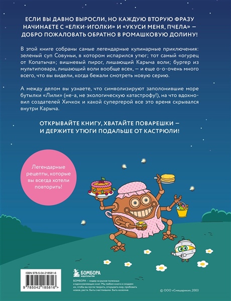 Погрузитесь в добрый и уютный мир Ромашковой долины, где каждый герой готов поделиться своим фирменным рецептом: суп с утюгом от Совуньи, огурец от Копатыча, бутерброд и идеальный нарезной батон от Лосяша и многое другое!