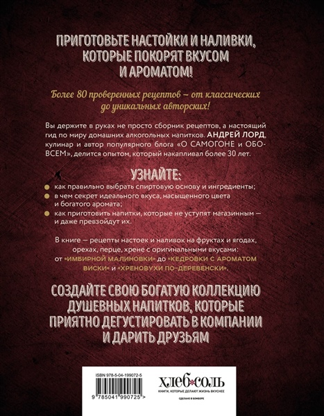 Качественная домашняя настойка — это не просто напиток. Это вкус, который вы создаёте сами. Автор книги — Андрей Лорд, один из самых популярных блогеров в теме домашних напитков — собрал более 70 проверенных рецептов наливок и настоек, от кедровок до хреновухи, от мягких фруктовых до ароматных «коньяков». В книге вы найдёте: - Настойки на ягодах, фруктах и сухофруктах. - Острые рецепты на перце, хрене и специях. - Кедровки с необычными добавками: манго, финики, виски. - Домашние «коньячные» настойки с насыщенным ароматом. - Пошаговые рекомендации: от выбора основы до идеального купажа. Все рецепты адаптированы для домашнего приготовления, с учётом реальных условий и доступных ингредиентов. Особое внимание — чистоте, качеству и выдержке: автор делится не только рецептами, но и опытом. Вдохновляйтесь и готовьте напитки, которые будут просить повторить!