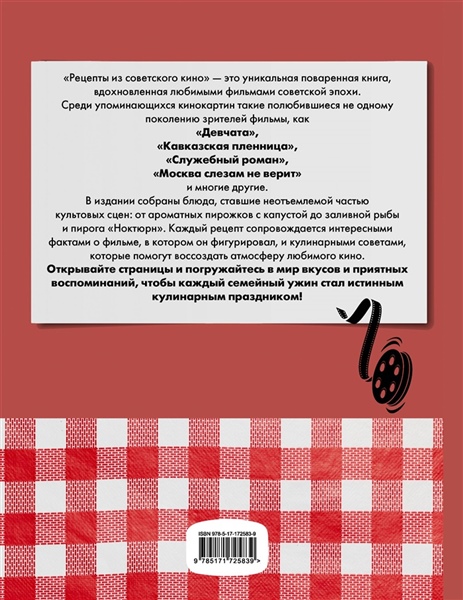 "Рецепты из советского кино" — это уникальная поваренная книга, вдохновленная любимыми фильмами советской эпохи. Среди упоминающихся кинокартин такие полюбившиеся не одному поколению зрителей фильмы, как "Девчата", "Кавказская пленница", "Служебный роман", "Москва слезам не верит" и многие другие. В издании собраны блюда, ставшие неотъемлемой частью культовых сцен: от ароматных пирожков с капустой до заливной рыбы и пирога "Ноктюрн". Каждый рецепт сопровождается интересными фактами о фильме, в котором он фигурировал, и кулинарными советами, которые помогут воссоздать атмосферу любимого кино. Открывайте страницы и погружайтесь в мир вкусов и приятных воспоминаний, чтобы каждый семейный ужин стал истинным кулинарным праздником!