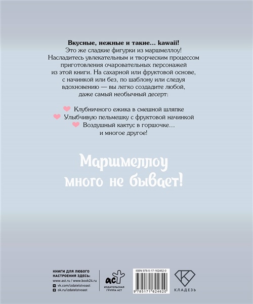Вкусные, нежные и такие…kawaii? Это же сладкие фигурки из маршмеллоу! Насладитесь увлекательным и творческим процессом приготовления очаровательных персонажей из этой книги. На сахарной или фруктовой основе, с начинкой или без, по шаблону или следуя вдохновению — вы легко создадите любой, даже самый необычный десерт: • Клубничного ежика в смешной шляпке; • Улыбчивую пельмешку с фруктовой начинкой; • Воздушный кактус в горшочке… и многое другое! Маршмеллоу много не бывает!