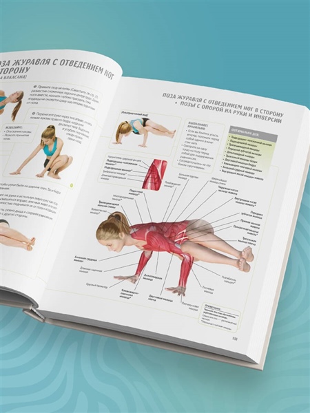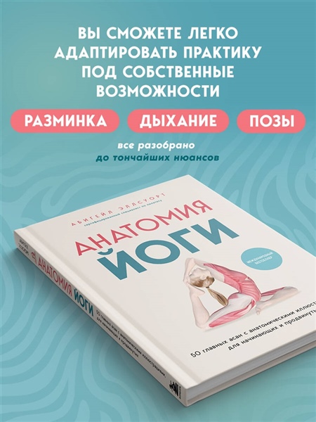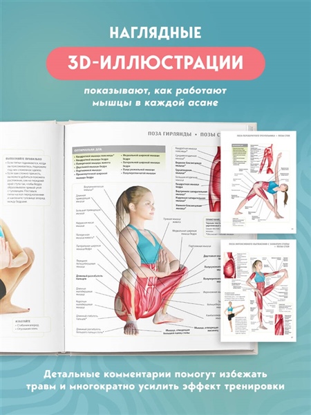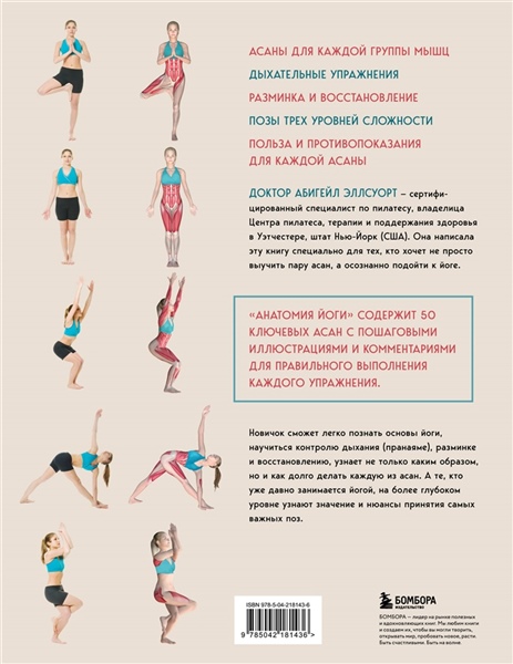 «Анатомия йоги» содержит 50 ключевых асан с пошаговыми иллюстрациями и комментариями для правильного выполнения каждого упражнения.