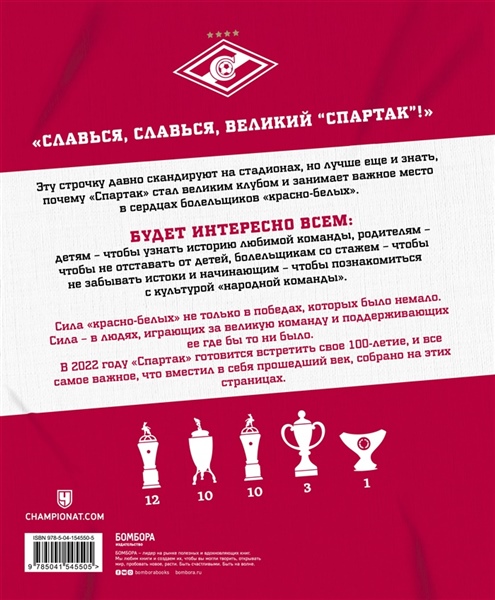 "Славься, славься, великий “Спартак”!" Эту строчку давно скандируют на стадионах, но лучше еще и знать, почему "Спартак" стал великим клубом и занимает важное место в сердцах болельщиков "красно- белых". Будет интересно всем: детям — чтобы узнать историю любимой команды, родителям — чтобы не отставать от детей, болельщикам со стажем — чтобы не забывать истоки и начинающим — чтобы познакомиться с культурой "народной команды".