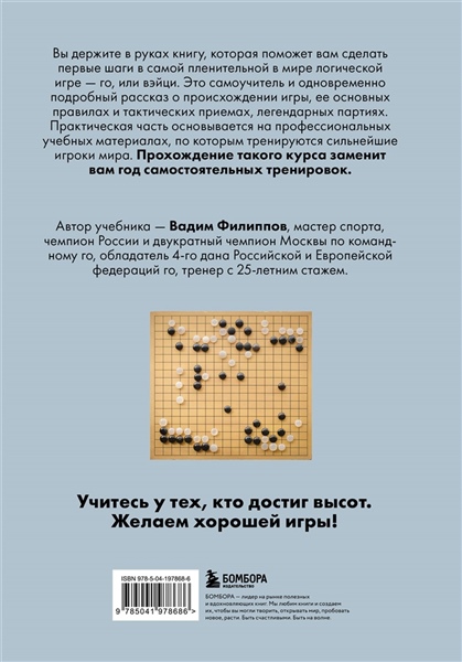 Автор учебника — Вадим Филиппов, мастер спорта, чемпион России и двукратный чемпион Москвы по командному го, обладатель 4-го дана Российский и Европейской федераций го, тренер с 25-летним стажем.