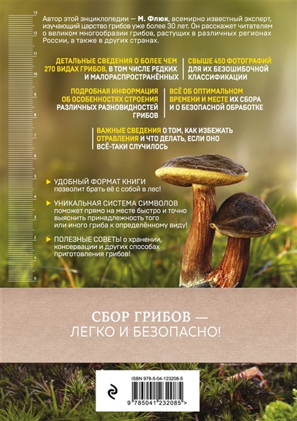 Справочник практических навыков для тех, чьё хобби — сбор и приготовление грибов. С помощью этого гида читатели смогут уверенно ориентироваться в их огромном многообразии, чётко отличать съедобные грибы от несъедобных, понимать, где и когда предпочтительнее искать тот или иной вид, выяснить ряд тонкостей приготовления различных грибных блюд. Книга содержит подробнейшие сведения об особенностях шляпок, ножек, шипов, пор, трубочек, пластинок более чем 270 видов грибов, а также свыше 450 их детальных фотографий. Кроме того, любители сбора грибов получат немало необычной и полезной информации — что такое микориза, почему в лесах образовываются так называемые ведьмины кольца, как грибы адаптируются к неблагоприятным условиям окружающей среды и так далее.
