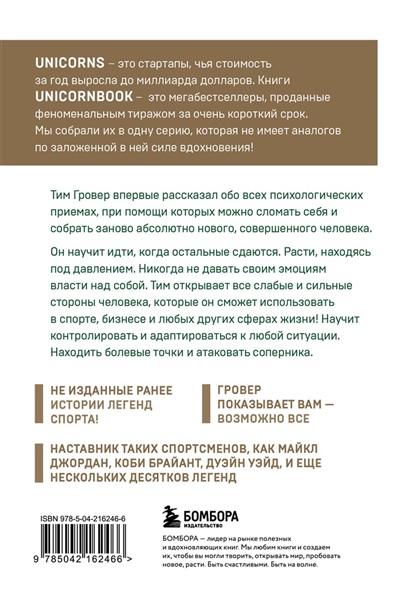 Тим Гровер впервые рассказал все психологические приемы, чтобы сломать себя и собрать заново абсолютно нового, совершенного человека. Он научит идти, когда остальные сдаются. Расти, находясь под давлением. Никогда не давать своим эмоциям власти над собой. Тим открывает все слабые и сильные стороны человека, которые он сможет использовать в спорте, бизнесе и любых других сферах жизни! Контролировать и адаптироваться к любой ситуации. Находить болевые точки и атаковать соперника. - НЕ ИЗДАННЫЕ РАНЕЕ ИСТОРИИ ЛЕГЕНД СПОРТА! - ГРОВЕР ПОКАЗЫВАЕТ ВАМ — ВОЗМОЖНО ВСЕ. - НАСТАВНИК ТАКИХ СПОРТСМЕНОВ, КАК МАЙКЛ ДЖОРДАН, КОБИ БРАЙАНТ, ДУЭЙН УЭЙД, И ЕЩЕ НЕСКОЛЬКИХ ДЕСЯТКОВ ЛЕГЕНД.
