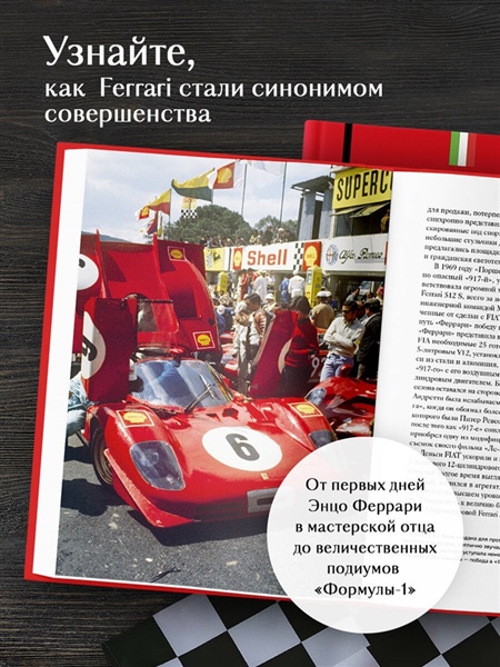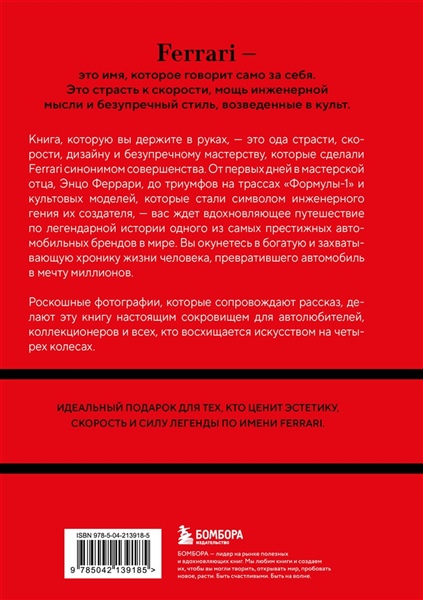 Ferrari — это имя, которое говорит само за себя. Это страсть к скорости, мощь инженерной мысли и безупречный стиль, возведённые в культ. Книга, которую вы держите в руках, — это ода страсти, скорости, дизайну и безупречному мастерству, которые сделали Ferrari синонимом совершенства. От первых дней в мастерской отца Энцо Феррари до триумфов на трассах «Формулы-1» и культовых моделей, которые стали символом инженерного гения их создателя — вас ждет вдохновляющее путешествие по легендарной истории одного из самых престижных автомобильных брендов в мире. Вы окунетесь в богатую и захватывающую хронику жизни человека, превратившего автомобиль в мечту миллионов. Роскошные фотографии, которые сопровождают рассказ, делают эту книгу настоящим сокровищем для автолюбителей, коллекционеров и всех, кто восхищается искусством на четырех колесах. Идеальный подарок для тех, кто ценит эстетику, скорость и силу легенды по имени Ferrari.