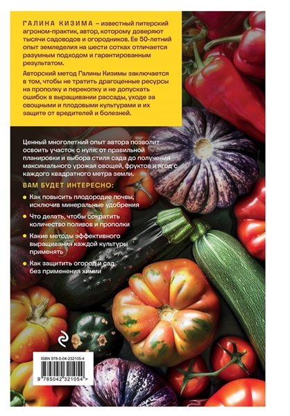 Как «перевоспитать» свой дачный участок так, чтобы он стал работать на вас, а не наоборот? Ведь всем нам хочется питаться натуральными овощами, фруктами, зеленью и ягодами, выращенными своими руками, но при этом не убиваться на грядках круглый сезон! Авторский опыт Галины Кизимы, известного садовода-практика, доказывает, что дача может стать не только местом каторжного труда, но и уютным уголком для отдыха. В этой книге доходчиво и толково объясняется, как можно научиться собирать первые овощи уже в июне, поливать даже самые требовательные растения один раз за сезон и навсегда забыть о прополке и перекопке земли.Для тех, кто мечтает о цветущих клумбах — специально созданные автором схемы «ленивых» цветников из простых и неприхотливых растений! Вам будет интересно знать: - Как перехитрить болезни и вредителей, чтобы навсегда избавиться от них? - На что способна ваша почва и как «включить» ее? - Как получить ранний урожай и удивить соседей? Галина Кизима — любимый автор дачников, ее 50-летний опыт успешного земледелия на шести сотках ценится миллионами садоводов и огородников за разумный подход, при котором вырастить ранний и богатый урожай можно даже при самых неблагоприятных климатических условиях, сэкономив при этом силы, время и деньги!